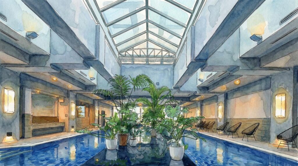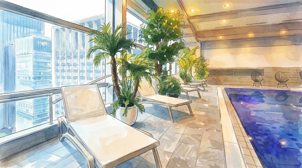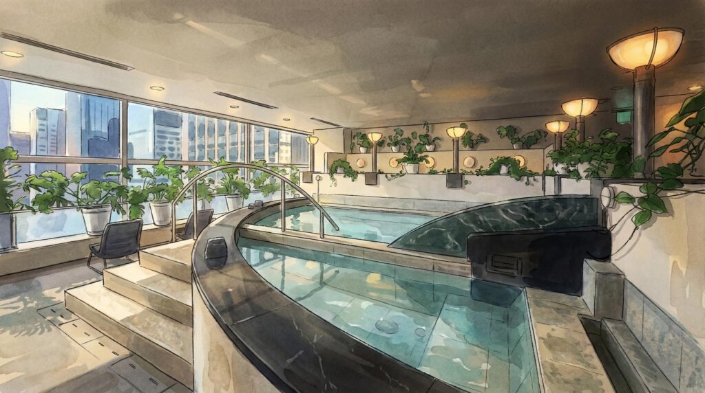 水温は約26〜27℃とぬるめ。「水風呂としては冷たくない」という意見も正直あります。でも、オートロウリュサウナで体の芯まで温まった状態でこのプールに入ると——不思議なことに「絶妙な気持ちよさ」があるんです。体が浮いていくような感覚というか。冷たい水風呂とは違う、もわっとした包まれる感覚です。