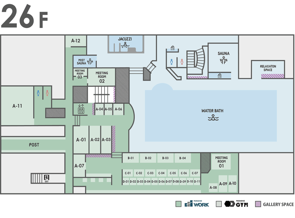 | 26Fプール | 26〜27℃ | 25m | 日本最大級・浮遊ととのい |