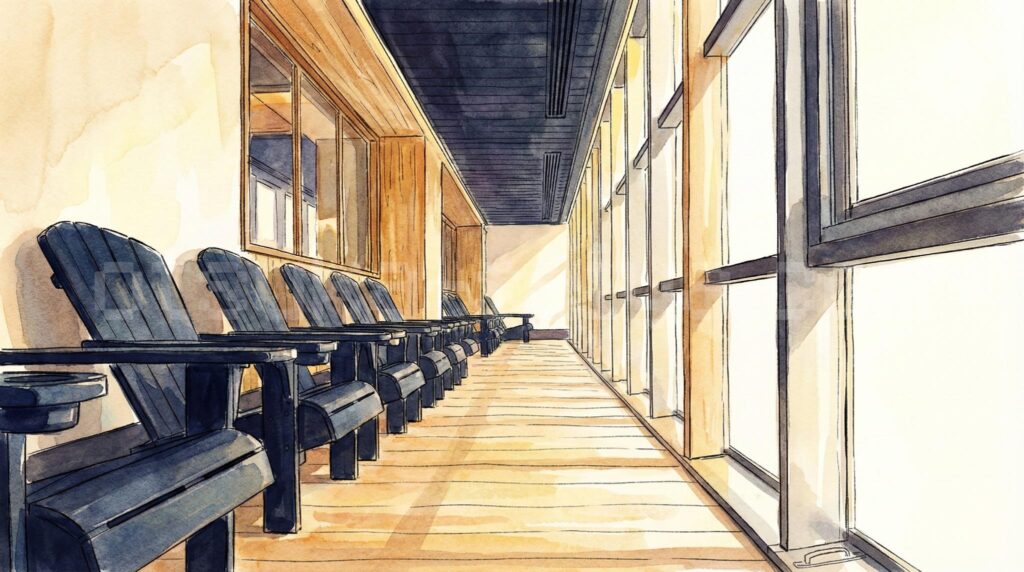 外気浴スペースは設けられておらず、休憩は浴室内のイス5席・デッキチェア3席・木製ベンチのみ。浴室全体が温かいため、純粋な外気浴のような「ととのい」体験はやや弱めです。朝サウナ後に部屋で横になるなど、宿泊者ならではの整い方を工夫するといいかもしれません。 - ピーク時(土日祝16〜18時)はサウナ室がすし詰め