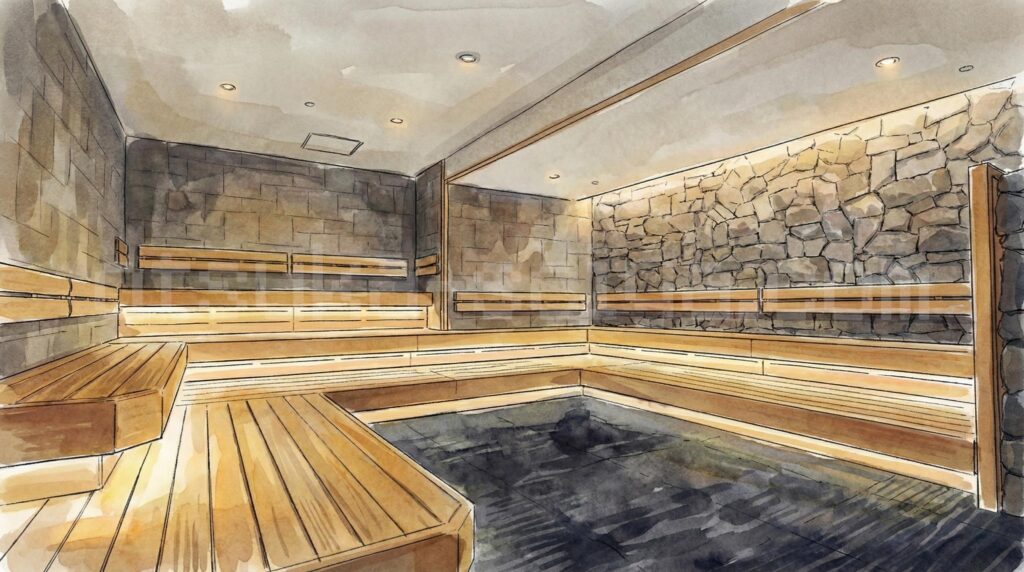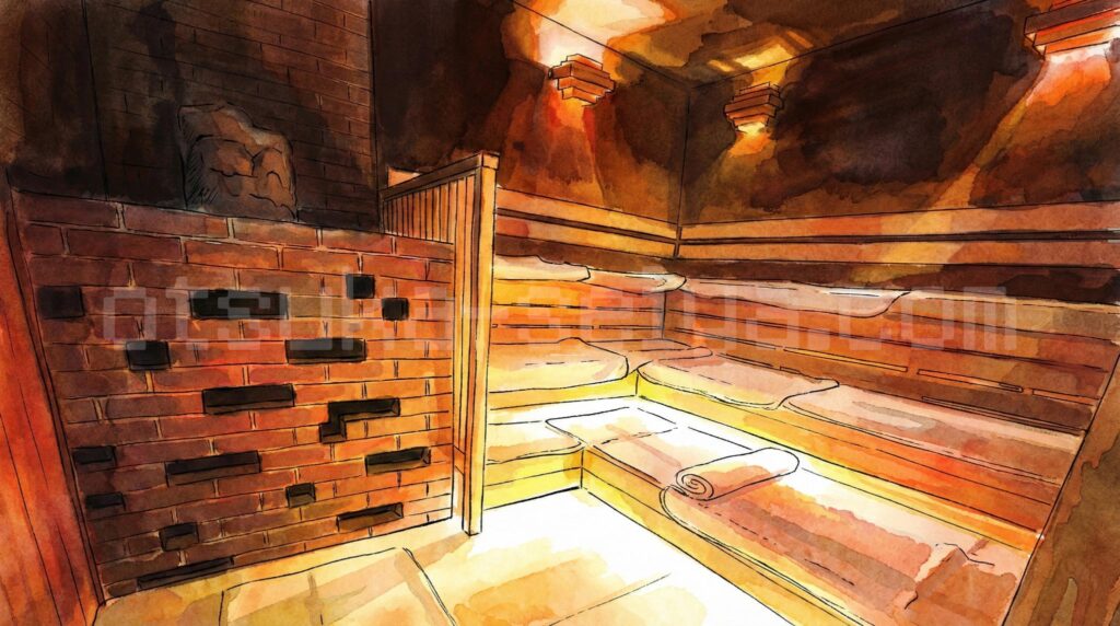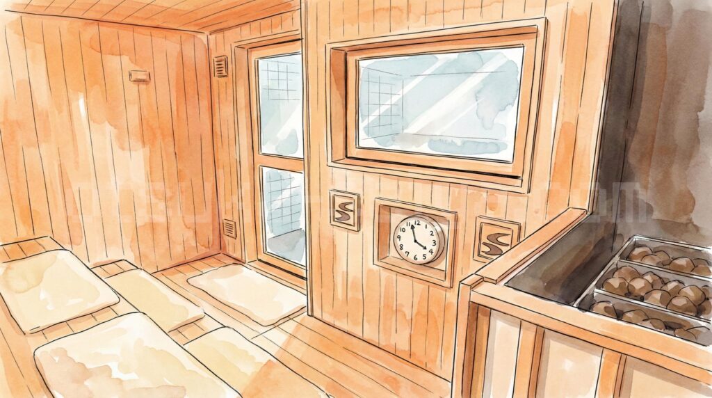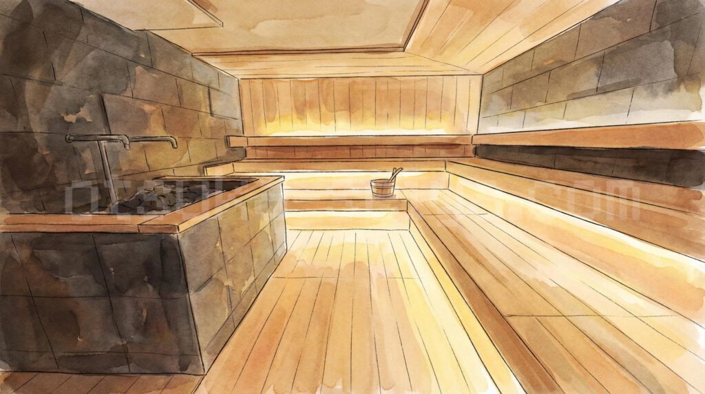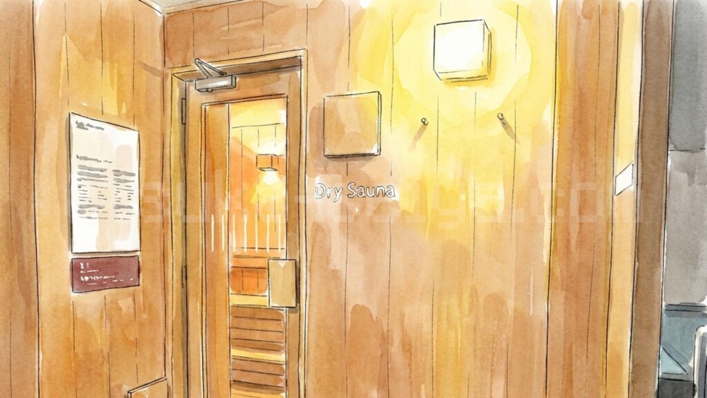 - サウナ室はTV無しで静かな環境、男性用は約97℃でしっかり熱く、集中してととのえます。