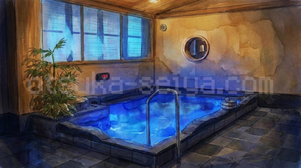 - 水風呂は約15℃でバイブラが弱めなので、避けて座れば羽衣を保ったまま長く入れます。ブルーの照明が清涼感を演出していて気持ち良かったです。