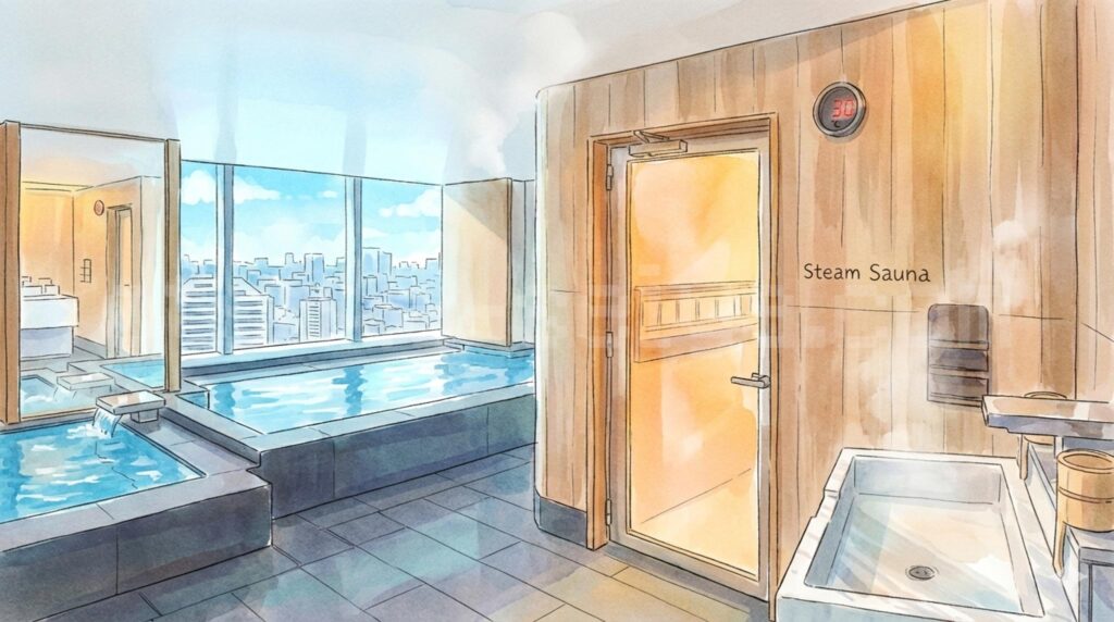 フィットネスクラブ内にあるため18歳未満は利用不可。宿泊者でも1人あたり2,200円が必要です(クラブフロア・スイート宿泊者は無料)。日祝は21時終了なので、チェックイン時刻と併せて計画を。 - 女性はスチームサウナ54℃のみ、水風呂なし