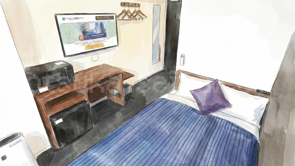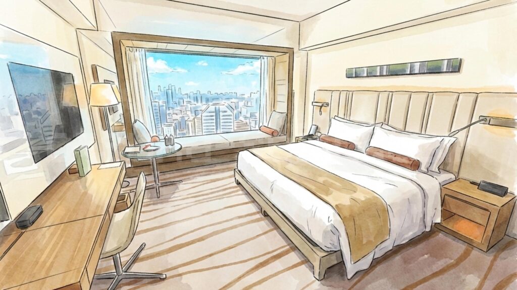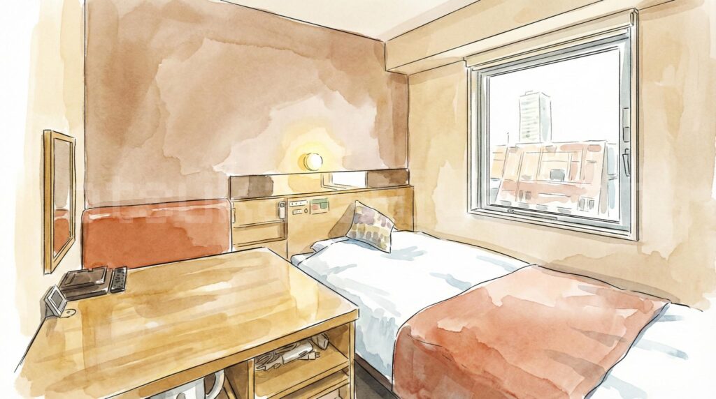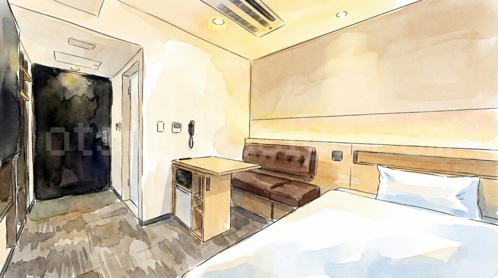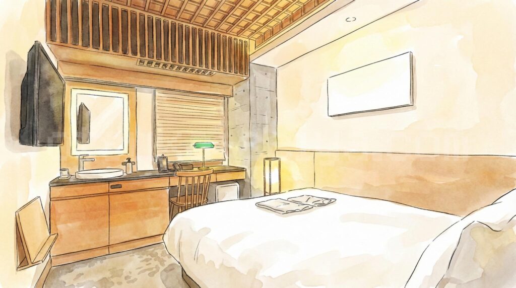 L字型3段式で収容12〜16名のサウナ室は、アウフグース時間帯(土日祝16〜18時)に待ちが発生することもあります。サウナイキタイの集計では早朝5〜8時が最も空いているとのことなので、宿泊者なら朝サウナ→朝食→出勤の黄金ルートがおすすめです。 - 最安のセミダブル(13㎡)はかなりコンパクト