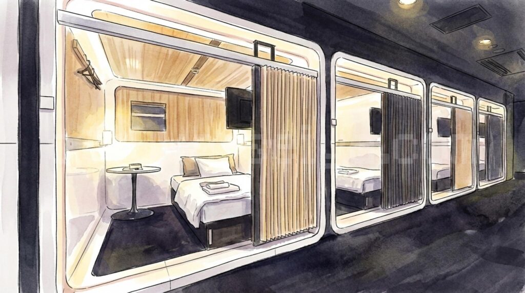 - 枕がプラスチックブロックのように硬くて、首が痛くなりました。カプセル自体は清潔ですが、寝具の質はもう少し改善してほしいです。