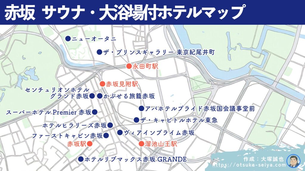 赤坂は「サウナ東京」などの有名施設が集まる激戦区。実は出張や観光の拠点として、都内屈指の癒やしスポットなんです。この記事では、ちょっとおっちょこちょいなサウナ好き、大塚誠也が、赤坂周辺で本当におすすめしたいサウナ・大浴場付きホテルを厳選しました。