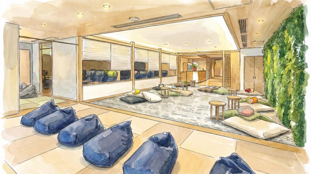 男女それぞれが自分のペースでサウナを楽しんで、それぞれが「ととのった」タイミングで3階に合流する。これが江戸遊のカップル利用の醍醐味なんです。「ととのった後のふたり」が合流するから、お互いの状態が最高に穏やかで、会話も弾む。友人にもそう説明したら「それ良さそう」と素直に納得してもらえました。