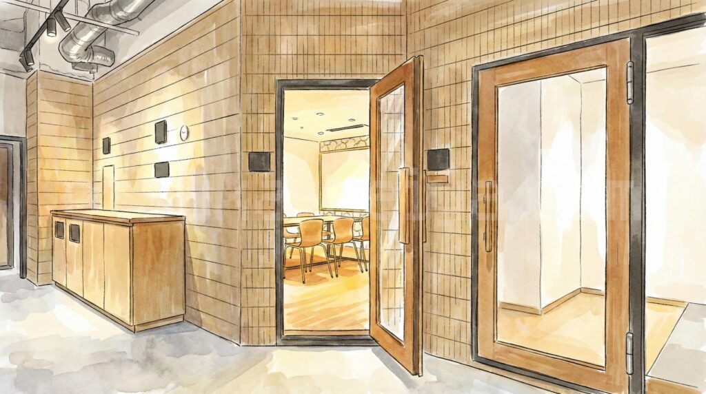 旧サウナ室を改装した防音性の高い会議室が、湯workの隠れた目玉です。