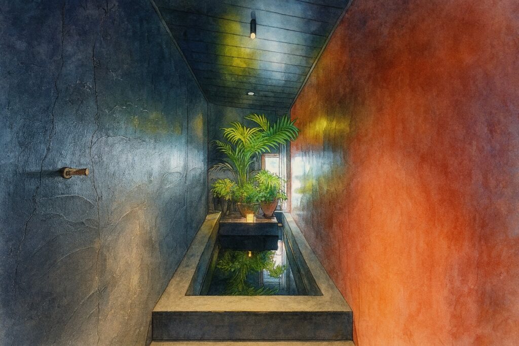 いよいよ館内へ。ここからの動線も、少しユニークで面白いものでした。一般的なサウナ施設とは、明らかに違う雰囲気が漂っています。