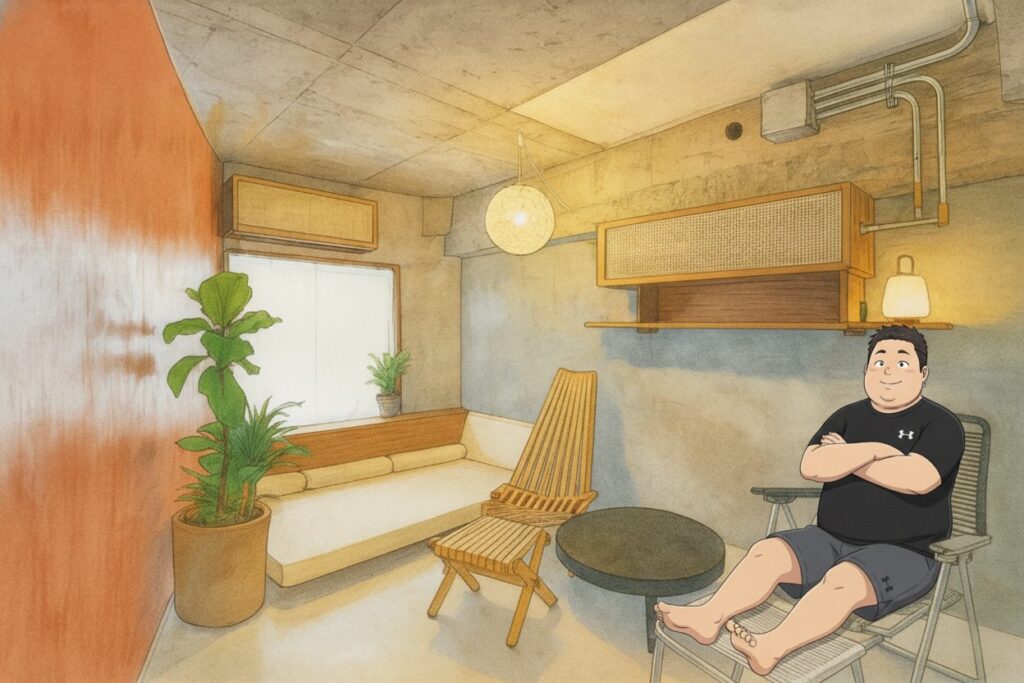 プライベートサウナというものに、実はこれまで縁がなかった僕。いつもは近所の銭湯サウナで汗を流すのが日課でした。入浴料500円+サウナ500円=計1,000円という価格で、毎週のように通っていたんですよね。でも、ある日SNSで流れてきた「畳に寝転がれるサウナ」という言葉に、心をグッと掴まれてしまいました。