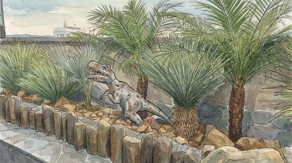 露天風呂は「恐竜と東尋坊」をイメージしたデザインで、壁面に恐竜オブジェ、床に足跡タイル、化石レプリカまで配置されています。「なんかここ、福井に来たって実感あるな」と思える空間でした。