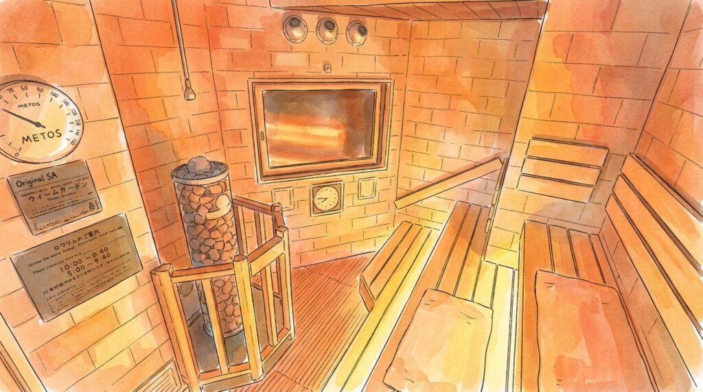 サウナ室に入ると、まず柑橘系のアロマの香りがふわっと広がります。これ、最高じゃないですか。旅の疲れを嗅覚から癒してくれる感じがして、入室前から「ととのいが来そう」な予感を覚えました。