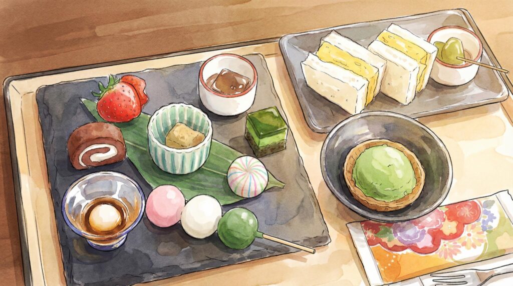 夜の楽しみがもう一つあって、それが1階の「羽二重 茶寮」の有料ラウンジです。チェックイン後15:00〜20:30(L.O.20:00)の間、宿泊者は1,500円/人で利用できます。ビール(サーバー生)、ハイボール、北陸3県の地酒(日本酒)、ワイン、サワー類が飲み放題。フードは枝豆、いなり寿司、羽二重餅、あんみつバイキング(アイストッピング自由)など。
