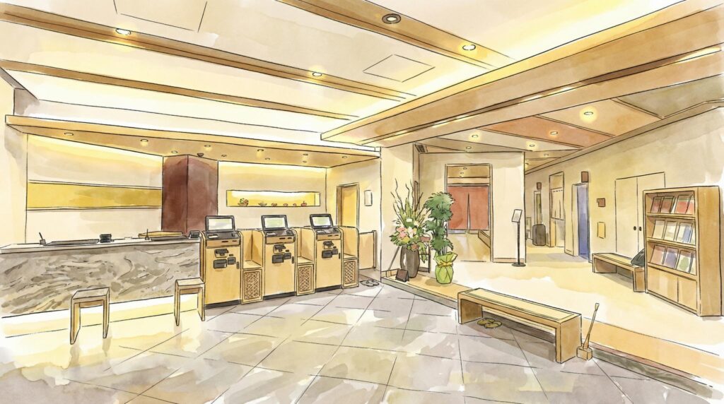 今回のテーマは「雅」。越前漆器、越前箪笥、そして永平寺・傘松閣の天井絵をモチーフにした壁画まで、館内のいたるところに福井の伝統工芸が散りばめられています。チェックインしてロビーを歩いただけで「あ、ここは普通のビジネスホテルじゃないな」と感じますよ。