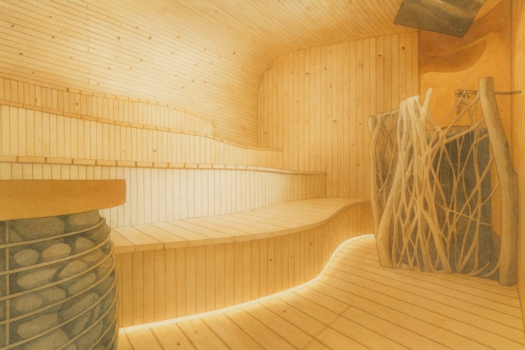 天井はR(曲線)が付いた設計で、ロウリュの蒸気を効果的に対流させてくれます。そして、BGMとして流れる小鳥のさえずりなどの自然音。目を閉じていると、まるで本当にフィンランドの森の中にいるような錯覚に陥りました。