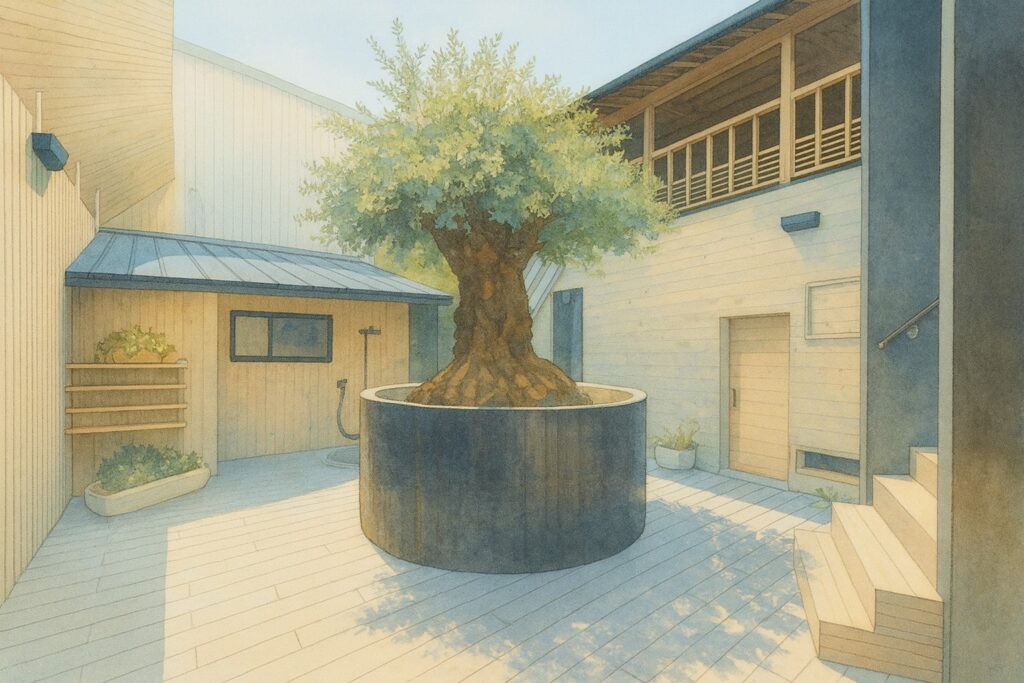 施設の扉を開けた瞬間、僕は言葉を失いました。中央に鎮座する樹齢700年のオリーブの木が、まるで古代の神殿のように静かに佇んでいるんです。このシンボルツリーを囲むように設計された空間は、コンクリートと木材が絶妙に調和した、ミニマルでありながら温かみのあるデザイン。