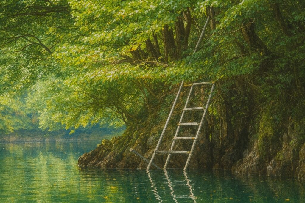 旗が示す脇道は、車一台がやっと通れるかどうかという細い道。そこからさらに、湖畔へと続く急な階段を下りていきます。運動不足の僕には、この階段が結構キツくて、リュックの重さが肩に食い込みます。でも、一歩一歩、下りるごとに周囲の緑は深くなり、文明の音が遠ざかっていく。まるで秘密基地へと続く道のようです。