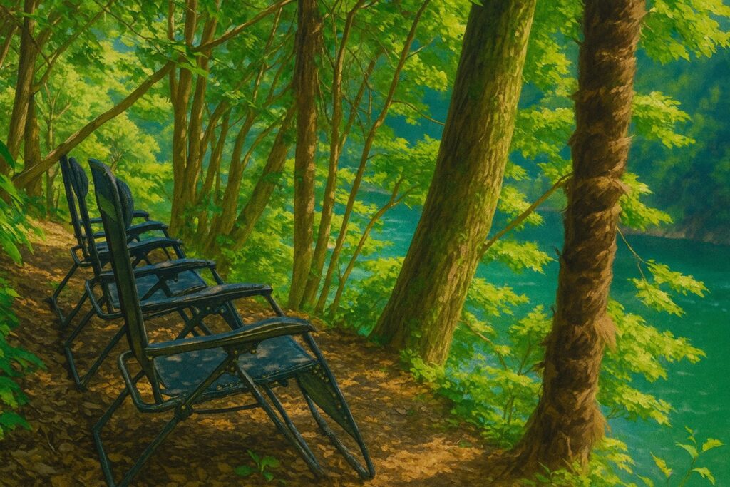 背中に感じる、水の優しい揺らぎ。頬を撫でる、森を渡る風。耳に届く、かすかな水の音。視界いっぱいに広がる、遮るもののない大自然。インフィニティチェアの比ではありません。まるで自分が自然の一部になったかのような、究極の浮遊感と一体感。
