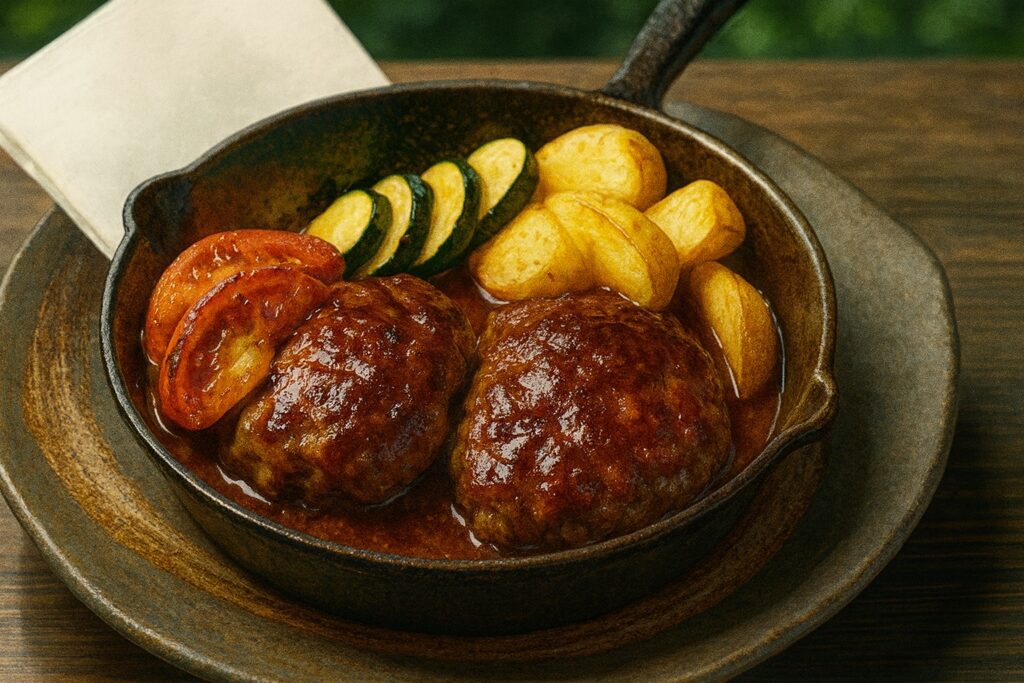 僕が注文したのは、このお店の看板メニュー「奥多摩ハンバーグ」。ブランド豚「諫美豚」を100%使った贅沢な一品なんです。薪火でじっくりと焼き上げられたハンバーグがテーブルに運ばれてくると、香ばしい匂いが食欲をそそりますね。