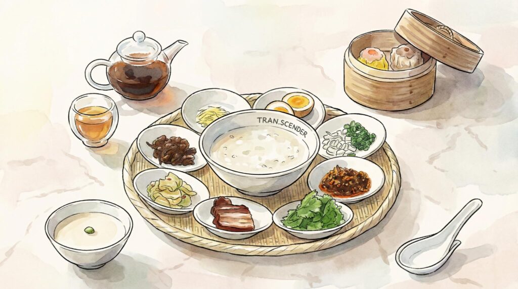 7:00〜9:30(宿泊ゲスト限定)、1名¥2,970(税込)です。メインは特製中華粥または海老ワンタン麺の2択で、広東式チャーシュー・点心・杏仁豆腐・中国茶が付いてきます。
