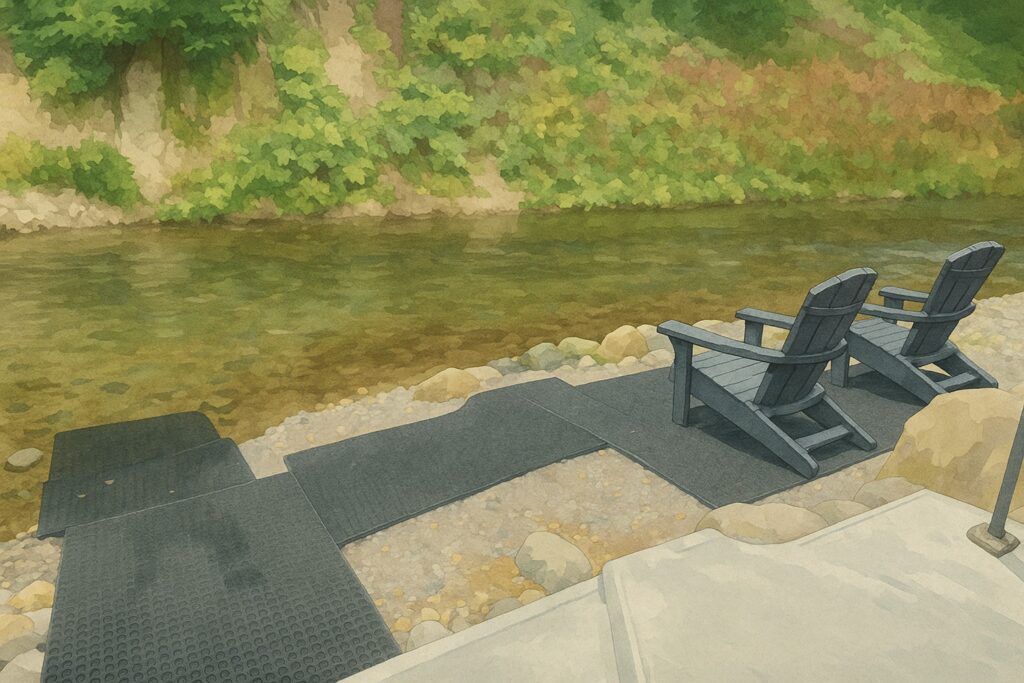 湯宿だいいちの外気浴スペースは、渓流沿いの露天風呂エリアに設置されています。男性用はリクライニングチェアが6脚以上、ととのい椅子が10脚以上と充実。さらに、川辺エリアという特等席もあるんです。